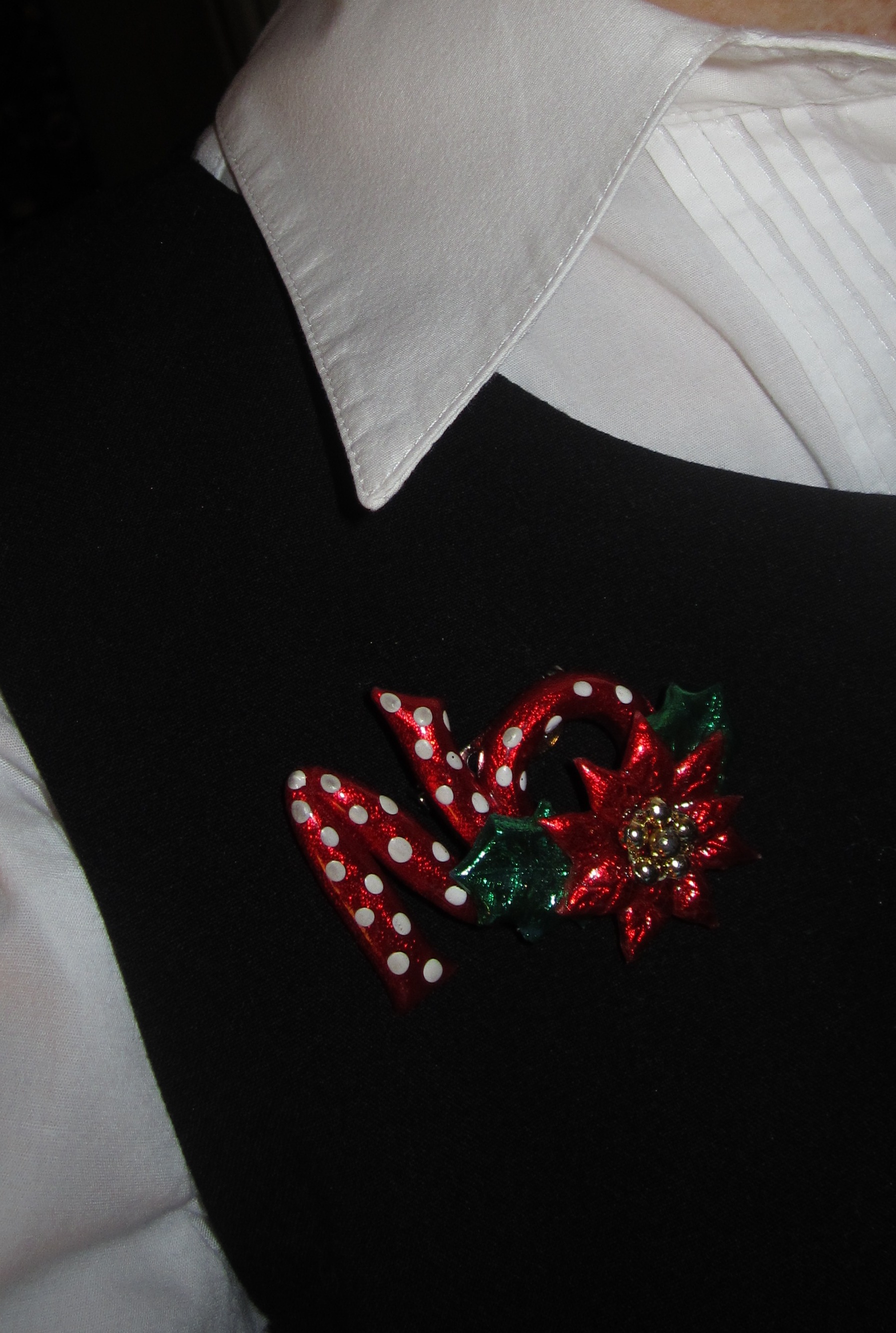 Skylar in particular has been fascinated with their “beauty,” and Nicholas has been concerned over the “pokey’s” on the broaches, wanting each one safely clasped. Last Sunday I pleased them all by wearing the biggest broach, a red ceramic “Noel” pin 5” long that included a chunky poinsettia.