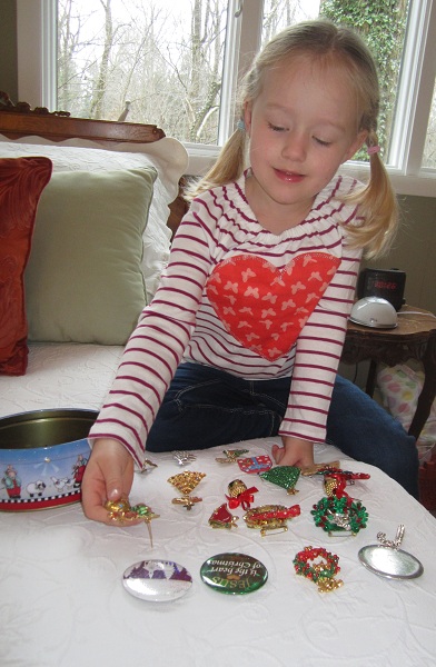 When the kids were little, they argued over who would wear which of the pins and trinkets in the jewelry tin, some of them crudely made by pudgy fingers in kindergarten. But for years now, my grown children haven’t cared to wear them, so I’ve been the only one dipping into the tin. That is until this year. Suddenly my old Christmas baubles have taken on new life in the hands of my grands.