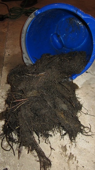 Little by little dirt follows roots into the pipe, and voila, a colossal clog. The guys pulled out a bucket-full of root-parts along with a generous supply of rich black soil, and it wasn’t long before the basement smelled like a newly rototilled garden.