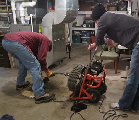 After a discouraging day yesterday trying to rod out a basement drain pipe, my brother-in-law Bervin and nephew Karl returned early this morning with a bigger, better cable machine, determined to solve the problem. They’d figured out that the pipe, on its way from our shower to the street sewer, had become blocked with hair-like roots surrounded by globs of dirt.