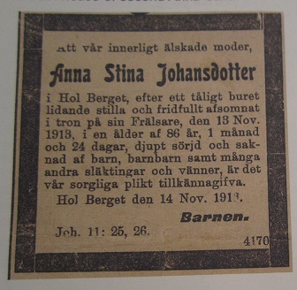 …that our dearly loved mother, Anna Stina Johansdotter in Hol Berget, after patiently bearing suffering, peacefully went to sleep with her faith in her Savior, Nov. 13, 1913, at an age of 86 years, 1 month and 24 days, deeply mourned and missed by children, grandchildren and many other relatives and friends. It is our sad duty to make this known.