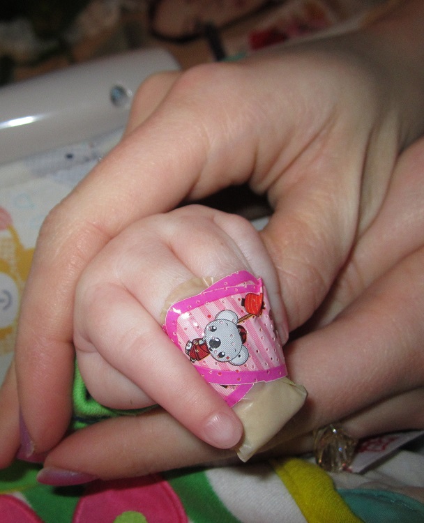 To speed the clotting process, we chipped some ice and put it in a baggie, but holding it next to her petite finger proved impossible. The only thing to do was bandage it tight, despite the smallest Band-Aid being far too big. As the bleeding continued, we taped two fingers together, placing one bandage over the tops and another around the knuckles, but immediately Emerald put both fingers in her mouth. Choking on a bandage would only compound our problems.