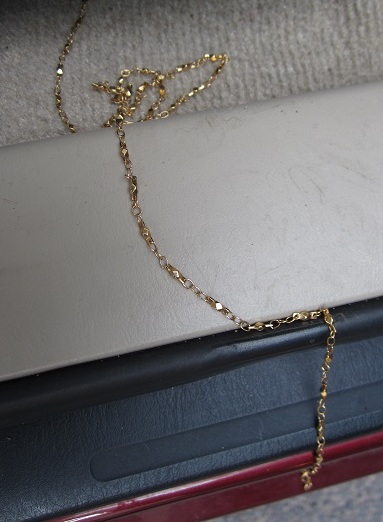 I got down on my knees to inspect the parking lot pavement under the car, behind the tires, under neighboring cars. Surely I’d find this pendant that was larger than a quarter and sparkling with flashes of light, but even back home there was no sign of it.