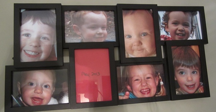 I hung up a huge poster frame, with each grandchild’s photo taped under the clear plastic cover. I am so excited for the news of Grand # 9; congratulations!