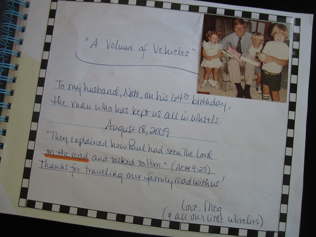 As I secretly tucked away photos over the years, I always knew they would one day be a special surprise for Nate. But it was tricky deciding when to give the scrapbook, since additional cars were always being added. Then finally I couldn’t wait any longer to see his reaction and decided to give it on his birthday in August, 2009. It must have been God prompting me, because that was his last birthday.