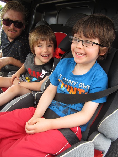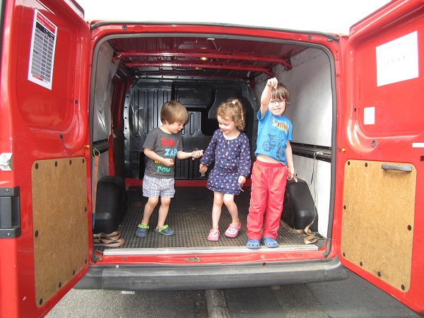 Since the van was being driven up from London, Hans arranged to take possession at the local train station so the driver had a way to get back. We arrived 10 minutes before he did, and the children sat on the station wall keeping a lookout for “a red postal van.” When Nicholas saw it, his eyebrows went up and his eyes grew wide.