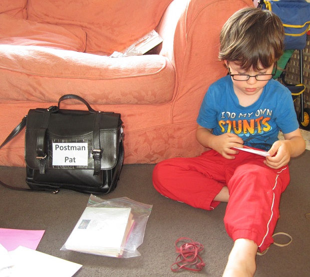 Nicholas’ has been all about mail since the cartoon “Postman Pat” became his favorite nearly 2 years ago (half a lifetime for him). For his last birthday I put together an official mail bag loaded with colored paper in several sizes, stickers that resembled stamps, a variety of envelopes, pencils, and pens. According to his parents, it’s been a hit.