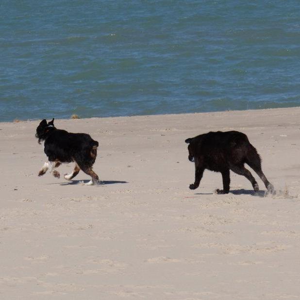 Just like any couple, we enjoy doing things together, and we also love the same treats. We agree on our very favorite thing, too: running around at the beach. Both of us have perfected happy dances in the sand, rolling upsidedown in an effort to become part of the landscape. Neither of us mind getting sand up our noses or in our eyes, and when we do the dance at the same time, it’s absolute magic.