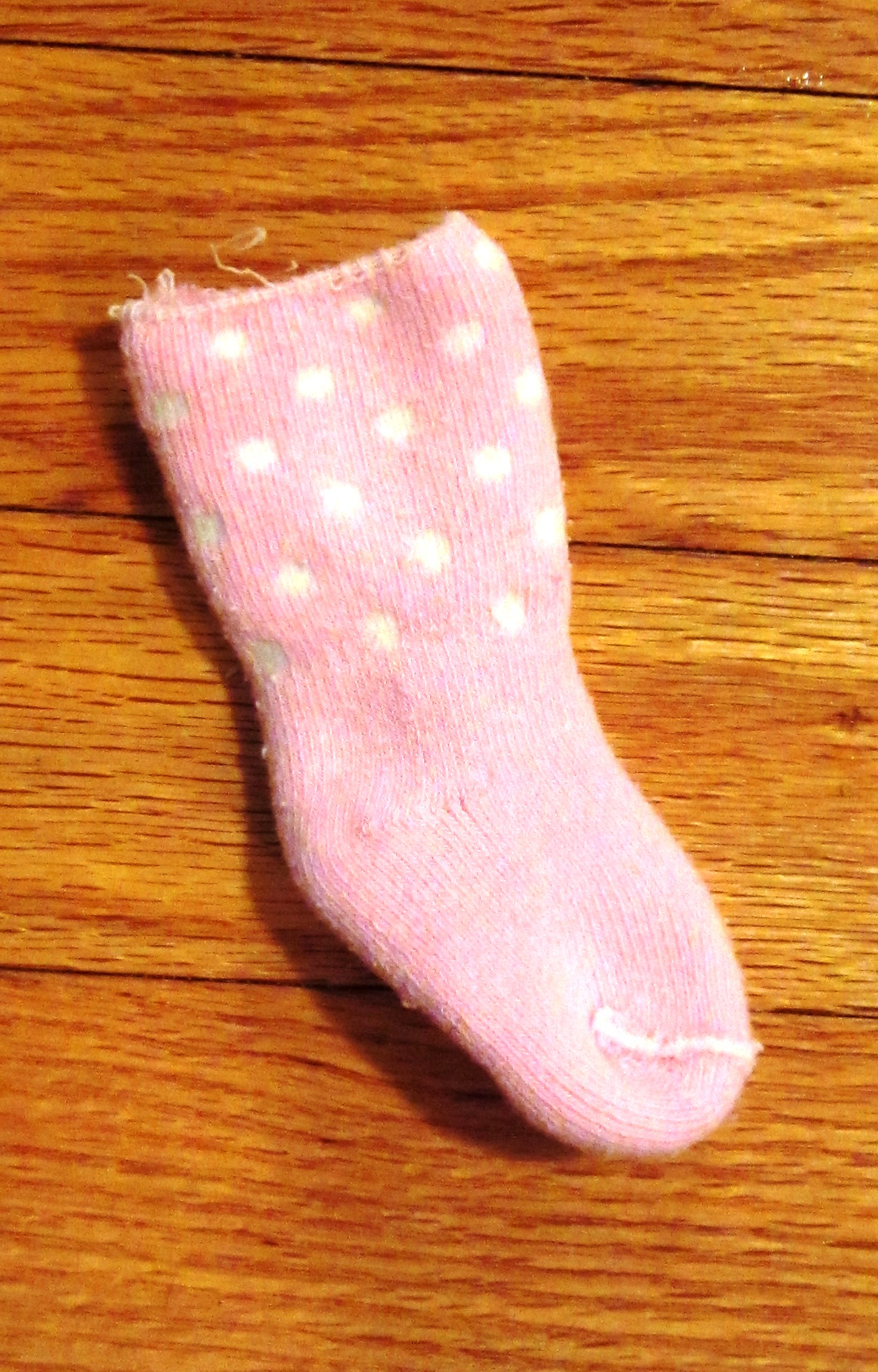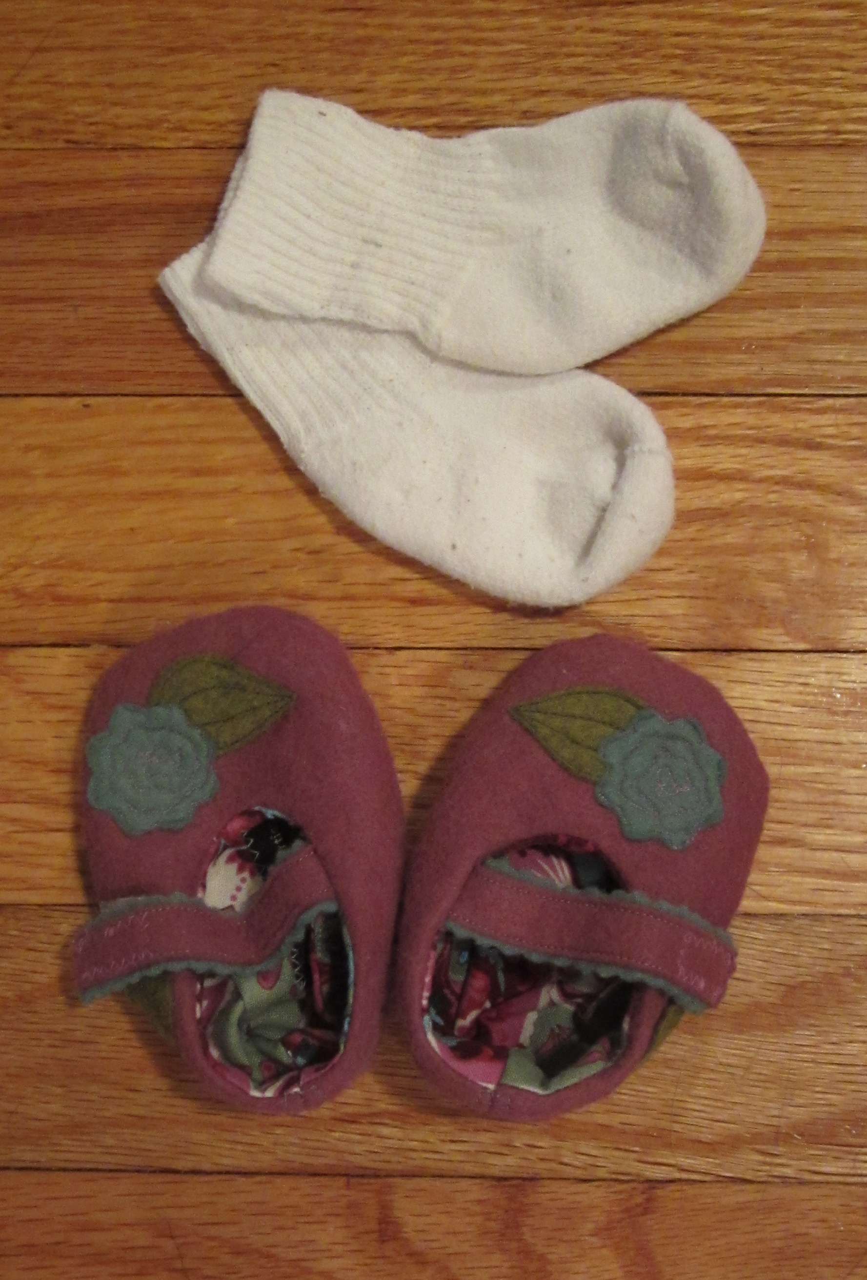 Emerald is forever pulling off her socks/booties and dropping them along the way, like Hansel and Gretel dropped bread crumbs. Although Birgitta, Louisa, and I try to keep an eye, it never fails that when we arrive home, one or both are missing.