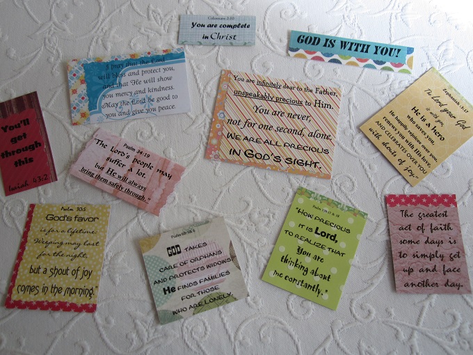 But the best part about Cathy’s note was the gift inside: a dozen colorfully decorated cards, each with an encouraging Scripture passage, and all of them laminated. As the cards spilled out of her envelope, I was overcome with her kindness, a woman I didn’t even know who wasn’t in “the club,” reaching out to one of its members.