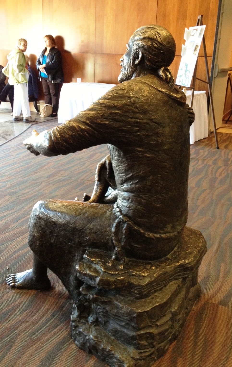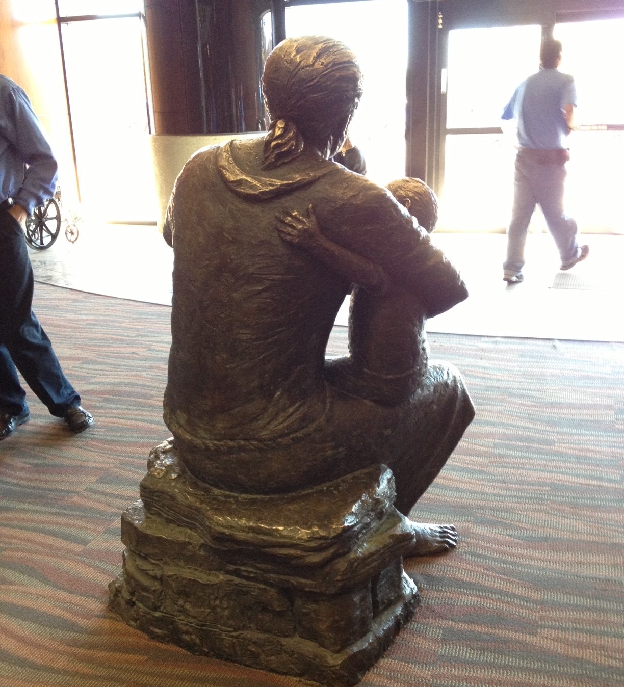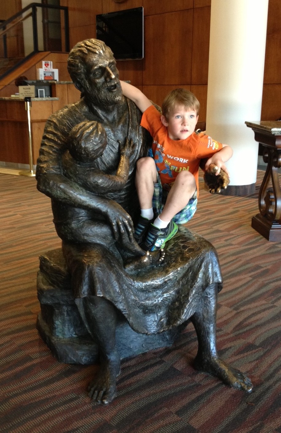 Once inside, I saw what they’d been talking about, a full-sized bronze Jesus holding a young child. Although his arm was wrapped around the toddler sitting on his knee (with the toddler’s arm wrapped around him), his other arm was up and open, welcoming anyone who might want to climb on the other side of his lap.