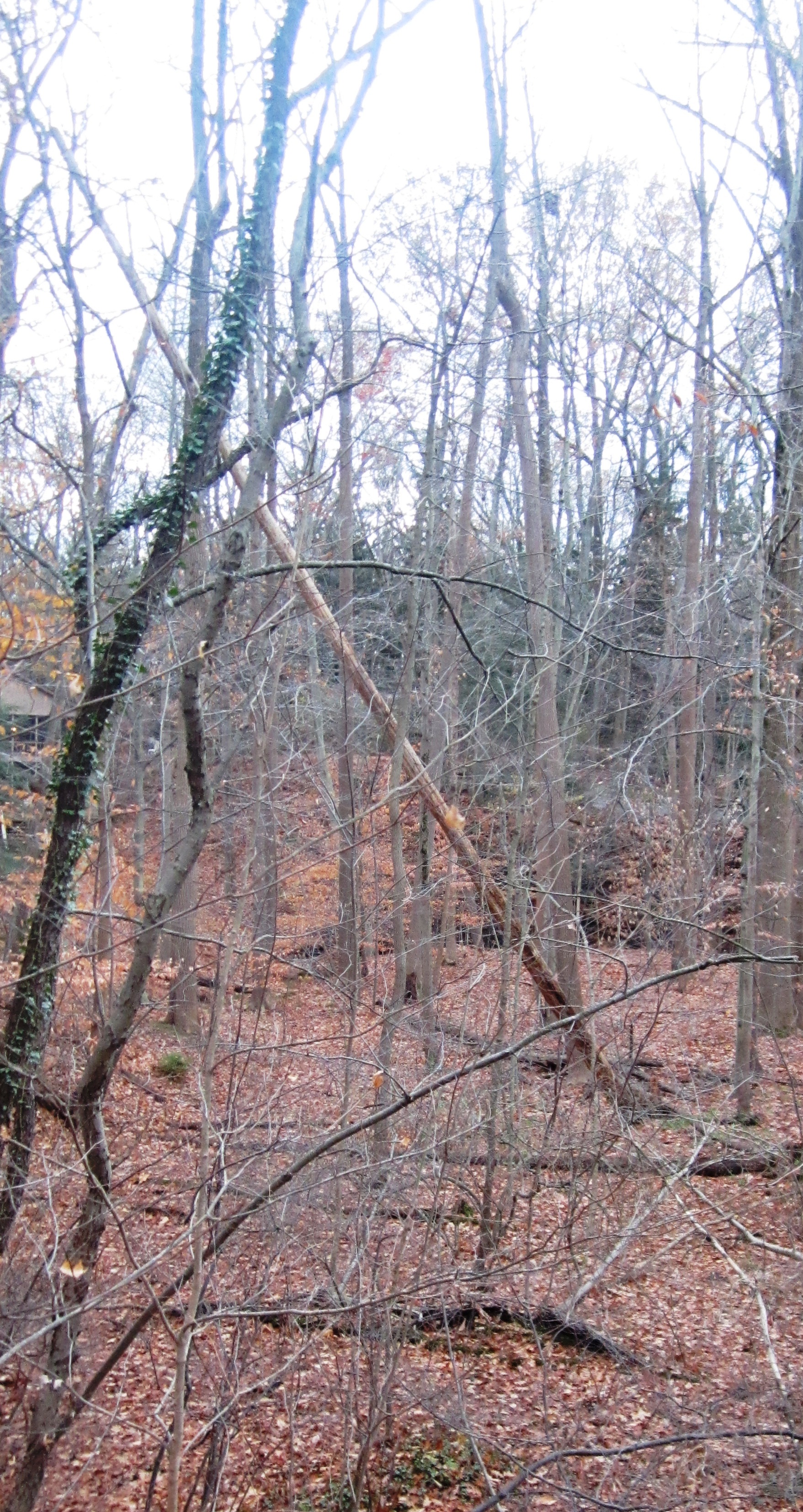 Stray tree limbs flew everywhere, and in our back yard a tall, pole-like tree went down, though not all the way. It fell into the “arms” of a nearby tree instead.