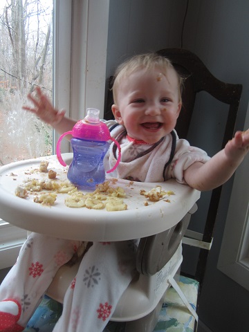 It’s interesting that after she’s been eating for a while, suddenly she’ll hold out her hand and make the sound of distress: “Ooo, ooo, ooo!” which translates, “Oh no! I’m messy! Wipe me off!” How she can be elbow-deep in sticky PB and slimy banana for 20 minutes before noticing is a mystery.