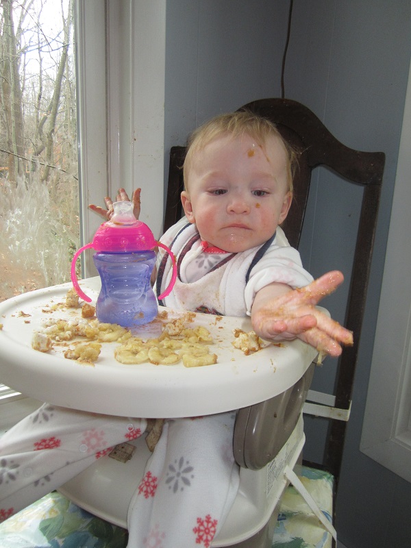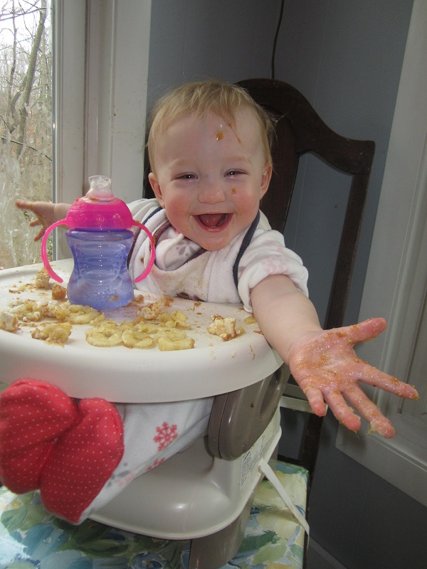 Emerald is slowly learning to feed herself, and it’s not a pretty picture. One favorite menu is peanut butter on rice cakes with a banana chaser, a combo that evolves into a goo she then uses to finger-paint a nearby window.