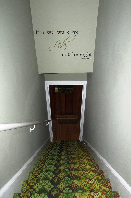 The other day I was walking down our narrow stairway with Emerald in my arms. She pointed to the wall in front of us and “verbalized” the familiar squawk she makes when she wants to stop and examine something. Posted in my stairwell is 2 Corinthians 5:7, God’s advice for us to walk by faith and not by sight.