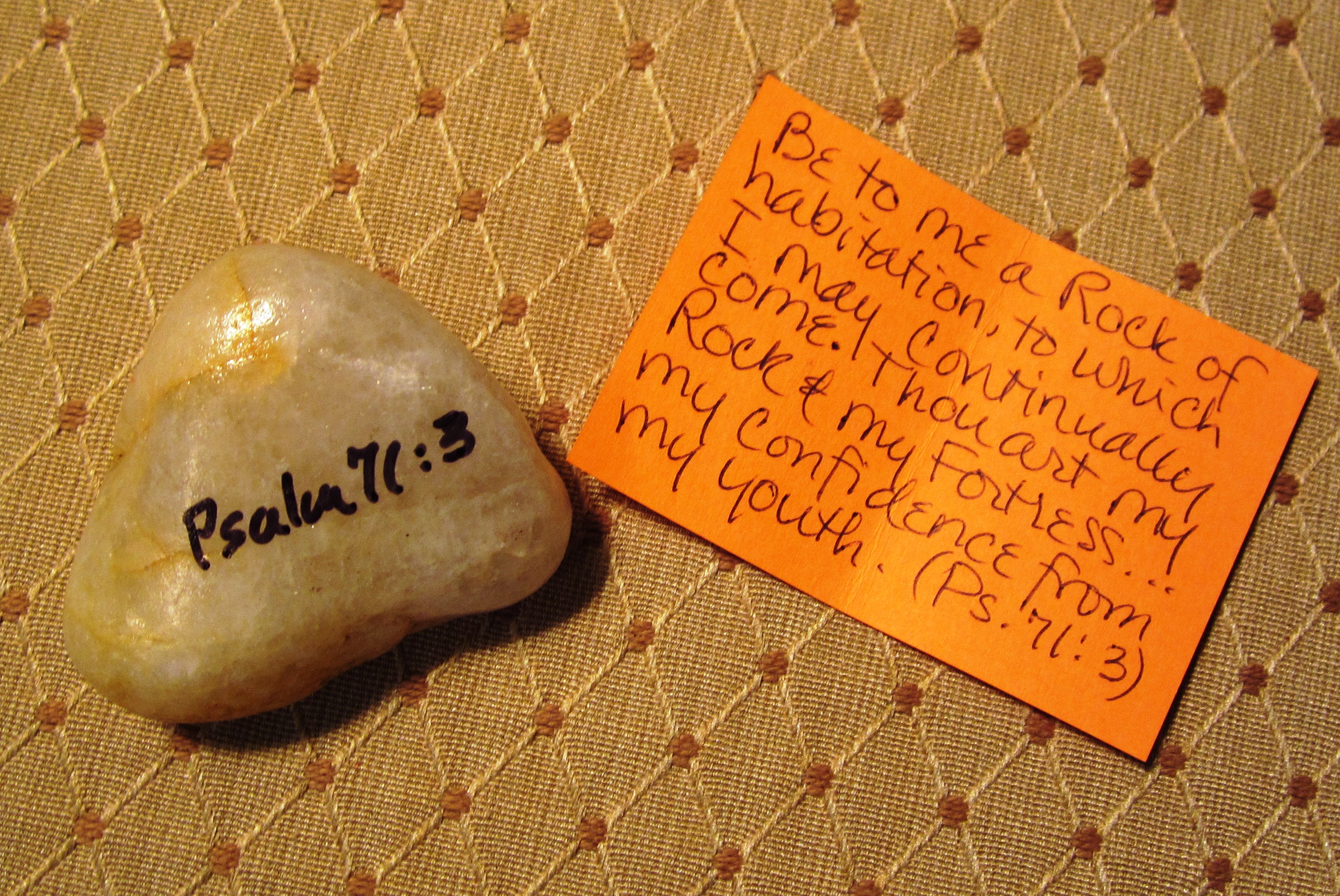 Today Margaret brought me a beautiful beach stone, the most beautiful one I’ve ever seen. On it was inscribed Psalm 71:3. This afternoon six year old [grandson] Beck read it for us. “Be to me a Rock of habitation, to which I may continually come. Thou art my Rock and my Fortress…my confidence from my youth.” I know, without doubt, God will never leave me or forsake me, and I’m clinging to Him and His Word to carry me all the way through.