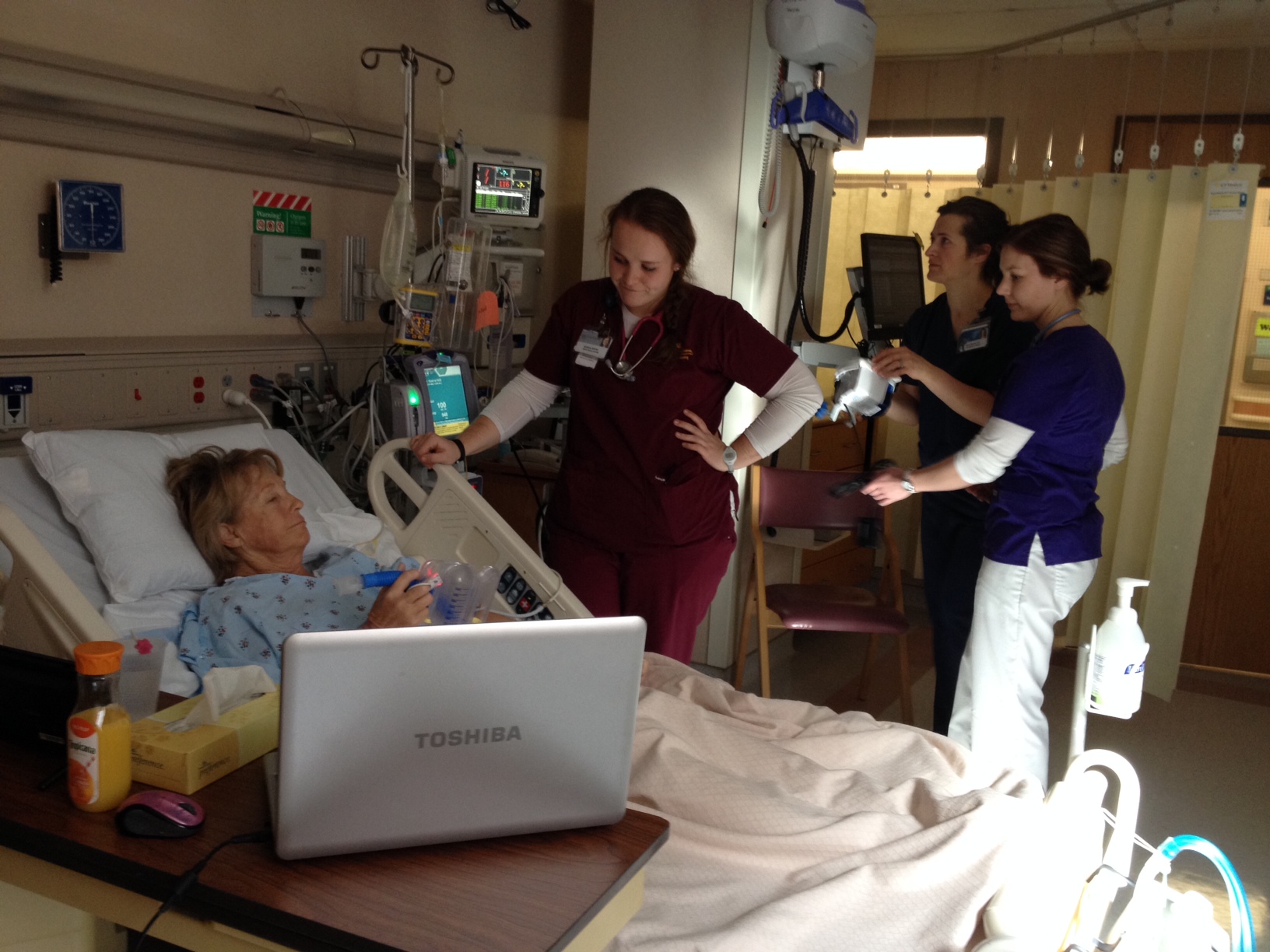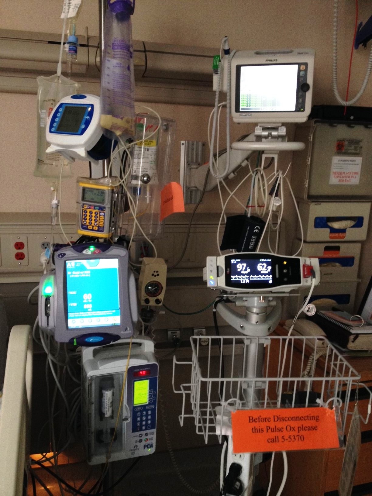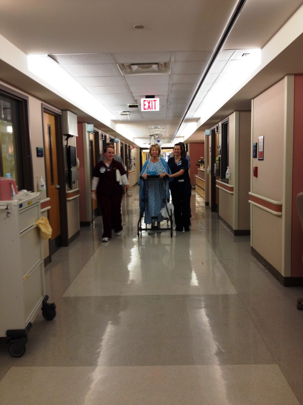 Less than 12 hours after surgery, despite Mary’s insides still being “angry” from extensive scalpel and stitch work, she was asked to get out of bed and take a walk. Never mind the 6 tubes with accompanying computerized screens that had to accompany her. It was time to rise.