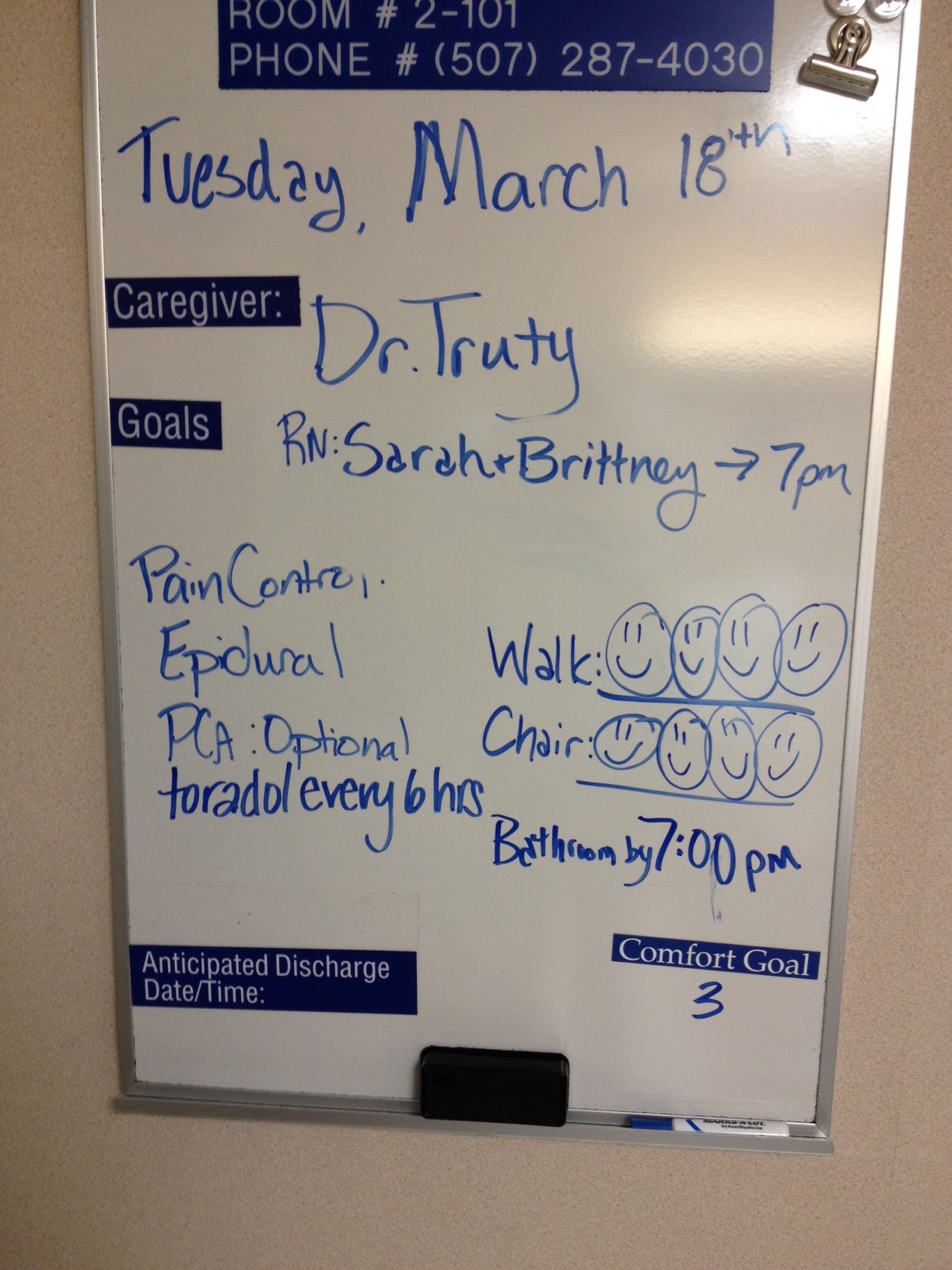 But by the end of this long, arduous day, she had earned 8 smiley faces on her status board for 4 successful episodes of sitting in a chair and 4 energetic walks down the hall and back with her pole of tubes and screens.