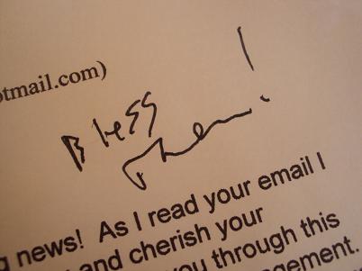 When I came to the fourth message from Pastor Lutzer and Rebecca, I had to get the Kleenex box. There on top of their two page email was Nate’s loopy handwriting of words written two days after his terminal diagnosis: “Bless them!” I must have printed the email for him to read privately, and as he sometimes did, he pulled out his pen and responded. His comment was written next to this statement from Rebecca: “As I read your email, I burst into tears…”