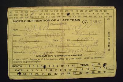 Yesterday I came across a coupon that expired last month. It had been good for a full year and was worth $8.00, but I didn’t know we had it. The title read, “NICTD CONFIRMATION OF A LATE TRAIN.” Google let me know that NICTD stands for Northern Indiana Commuter Transportation District, and it was clear what had happened.