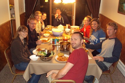 We shared a simple meal in preparation for our service, then between the spaghetti and the cake, moved to the living room for church. Adam opened the meeting with prayer, after which Katy and Klaus led us in singing, with Klaus accompanying on his guitar. Hans and Linnea took turns giving “a word,” Hans from Luke 19 and Linnea from 1 Thessalonians 5, and Lars and Louisa both read Scripture in conjunction with what was said. Nelson finished with a meaningful communion service using home-baked rolls and apple juice served by Louisa. Birgitta wrapped it all up with a benediction prayer.