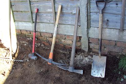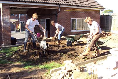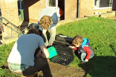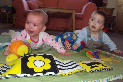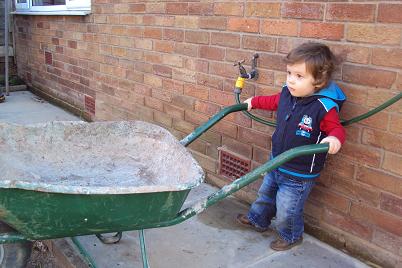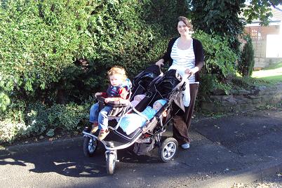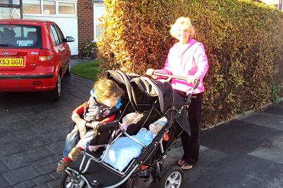 How about that great English sunshine? Looks like much work is getting done by those big strong guys. And the best is to see you with those darling babies! A three baby stroller is new to me–fun to push??!!