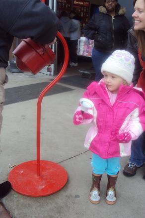It was a cold day in Michigan City but all the babies joined us for the event, bringing lots of attention and extra donations because they were there. Skylar and Nicholas never tired of putting coins into the kettles, scrutinizing the sidewalks for stray pennies (and finding them), after our supply had run out.
