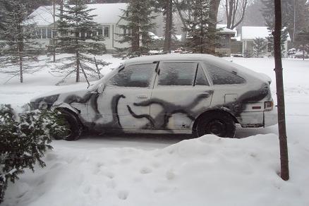 Like a homing pigeon, this car keeps coming back to us. I wrote about its coat of many colors (six of them) in another post [June 26, 2010], and now it boasts a seventh identity, snow-camouflage, the perfect fit for a Michigan winter.