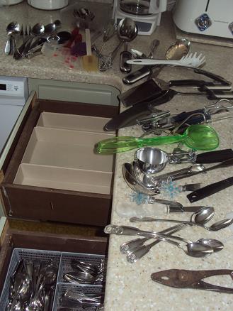 Today, with all the exclamation points of change poking at me for attention, I stood in the kitchen trying to figure out which one to tackle first. For no special reason I opened the utensil drawer where the odd-sized cooking tools were askew and absently began to rearrange things. Pretty soon the drawer contents were on the counter, and I was fingernail-scraping-off sticky old shelf paper.