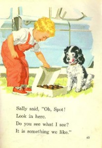 Each page was three-fourths picture and one-fourth text. “See Spot. See Spot run. Run, run run.” I grew to love this family that was similar to ours, a boy and two girls, a dog that looked like Spot, and a cat named (yes) Puff. Virtually all American children in public grade schools learned to read with Dick and Jane, from the 1930’s to the 1970’s.