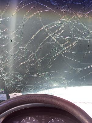 A corroded hood latch let loose, sending the hood sailing up and back with such force it smashed the entire windshield, depositing glass shards in her lap and at her feet, cracking the car roof and shaping it into a V.