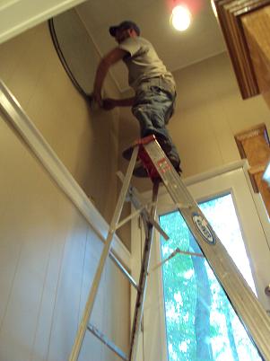 My builder (and nephew-in-law) Drew is closing in on the end of our 10 week project. On our tag list today was a chore he definitely didn’t have to do but kindly acquiesced to: hanging a heavy, round mirror 40 inches in diameter. Putting it on the hook wasn’t the problem. It was where that hook was located, 16 feet above the floor.