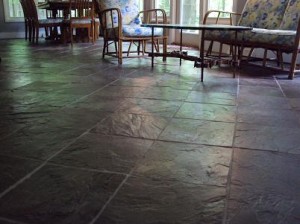 The floor is finished now, a stunning sight to my stone-appreciating eyes. This particular batch of slate was cut from a cliff in India, no two tiles alike. Since the colors vary widely, Drew put them down artistically, a greenish one here, tan there, navy across the room. The result is a floor tapestry of rock reminding me of The Rock.