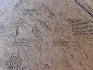 Drew was scheduled to start slathering mortar the next morning, so as usual, God’s timing was perfect. I magic-markered my favorite passages on the floor, claiming each word as my own. When Drew came to those verses, he balked at smearing his dark gray goop over them. Looking up at me, trowel in hand, he said, “But nobody’ll see them.”