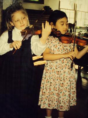 But not quite. When Birgitta turned 4, she began begging to learn the violin. I ducked her pleas for quite a while, but when her best friend Ellen began begging her mom, too, we compromised by letting the girls split lessons, 15 minutes each.