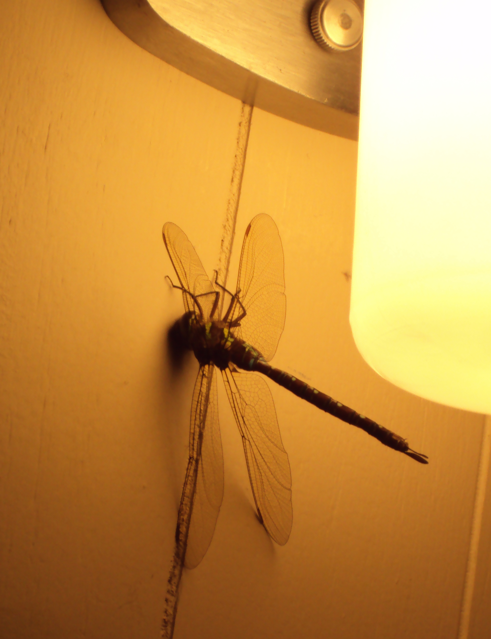 We found the garbage lid, covered the can, lifted it outside and set him free. But our encounter with wildlife hadn’t ended. As I reached to turn off the hall light, an 8” dragonfly emerged, the biggest, scariest, buzzingest insect I’d ever seen! Now it was my turn to scurry up the steps. With all the screaming going on, I worried our neighbors would soon appear.