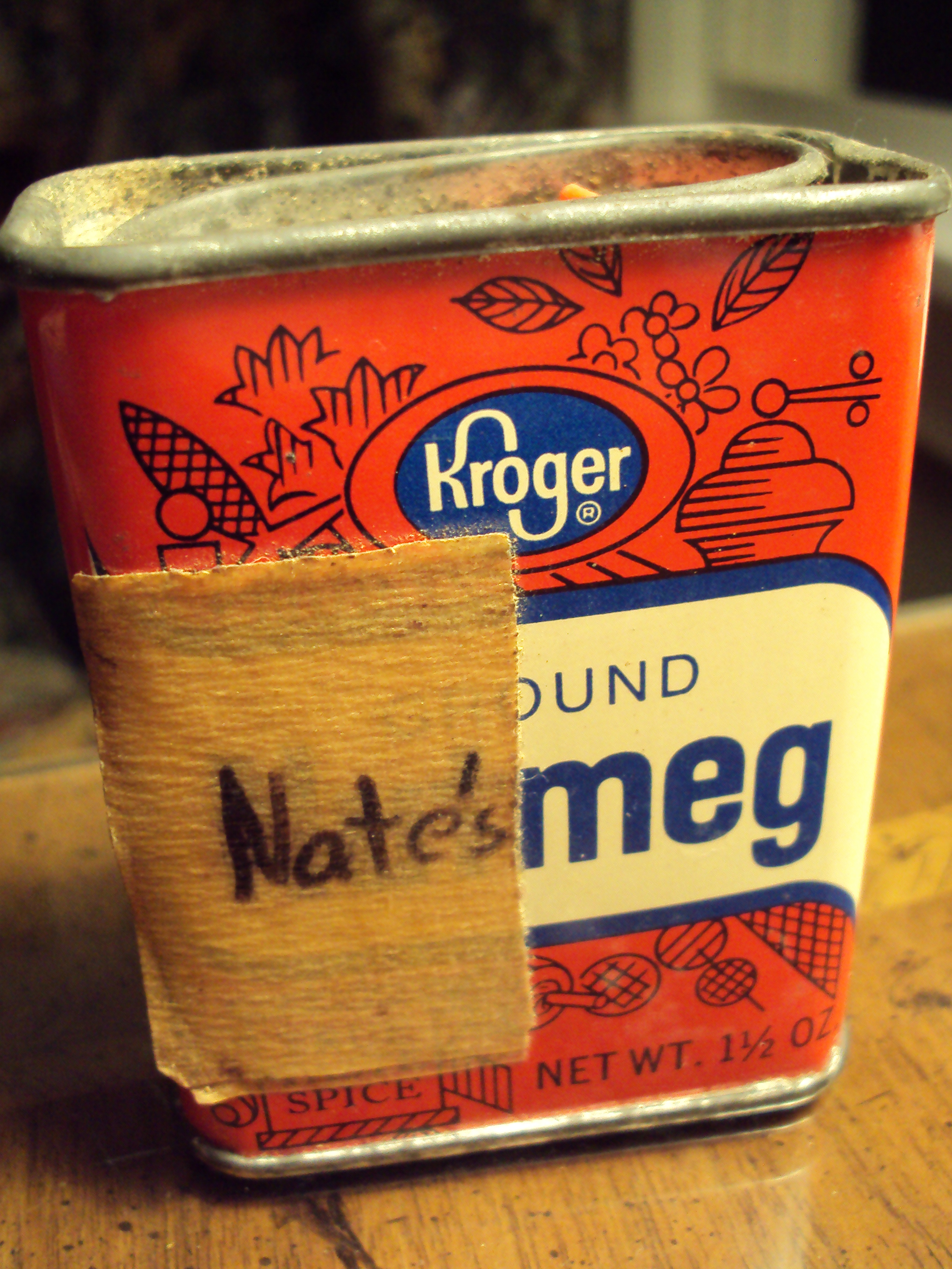 A month before we were married, I opened one of our two kitchen cabinets to get the cinnamon for toast and found a tiny love note attached to our lone spice can. Nate had taken a strip of masking tape, covered the “nut” in “nutmeg” and written “Nate’s” instead, i.e. “Nate’s Meg.” I loved it so much I’ve taken care of it for 42 years, and tonight the rusted can is sitting on my desk.