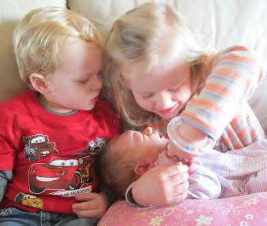Understanding this perspective, which is common in older siblings, gives us a clear picture of what’s just ahead for my daughter and son-in-law, who introduced a new baby one week ago. At the moment, everything is sunshine and light. Skylar, age 3, and Micah, 2, are still in a period of adjustment we used to call “the honeymoon stage” with the new baby still in the category of a new toy. “Can I hold the baby, Mommy?” is still being answered with, “Sure,” and cameras are still recording each episode. We’re praising their gentleness and finding it easy to continue the introductory litany: