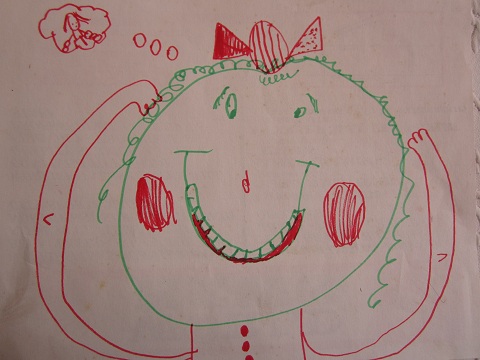 When she was little, though, she drew primitively like most children do. As her attention span lengthened and she focused on one piece of paper longer, she added more detail. This picture was drawn at age 4, and like all her creations, I loved asking her about it.