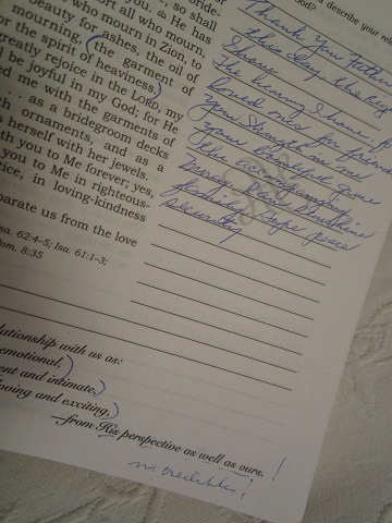 During the 4 hour plane ride home tonight, I immersed myself in what she wrote and was impacted by her honesty before her Lord, wondering if you readers might be impacted, too. Below are quotes from this journal, plucked with care so as not to reveal her secrets but to show all of us how a godly woman sees herself in relation to God: