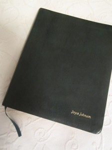 Friday’s blog post quoted what a good mentor might say through letters my Aunt Joyce had sent to me. Your response was delightfully enthusiastic, and over the weekend something lovely happened when I met up with her children at a wedding in Washington State. These California cousins handed me a green leather book with Aunt Joyce’s name embossed on the front. “You’ll enjoy looking at this,” they said.