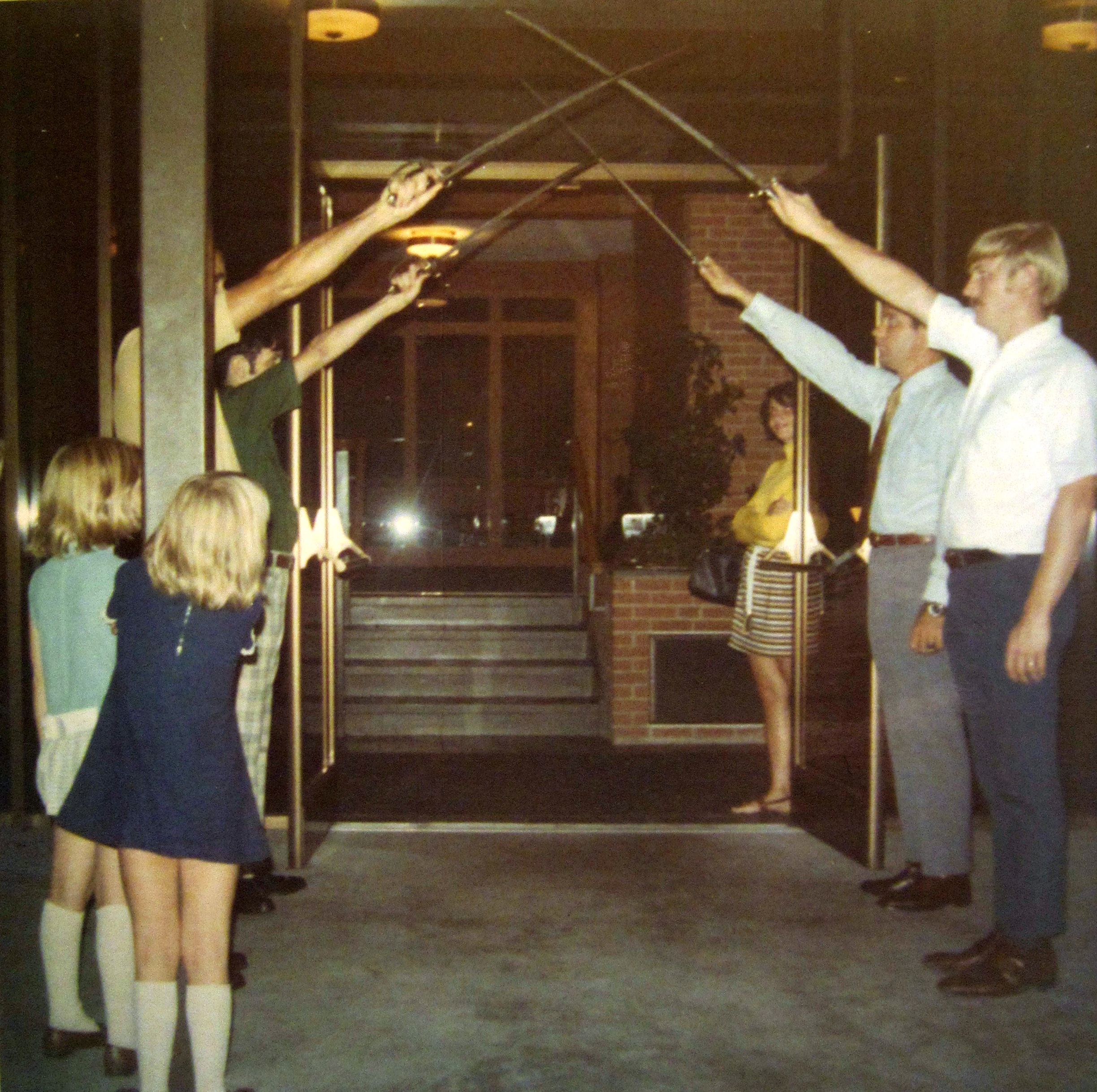 We were late arriving to the rehearsal, but Lynn filled us in. She directed Nate and his swords to the other three military guys where he passed along the instruction he’d received from the officer who’d given him the swords. Apparently it was important to hold them a certain way. He also gave them their white gloves.