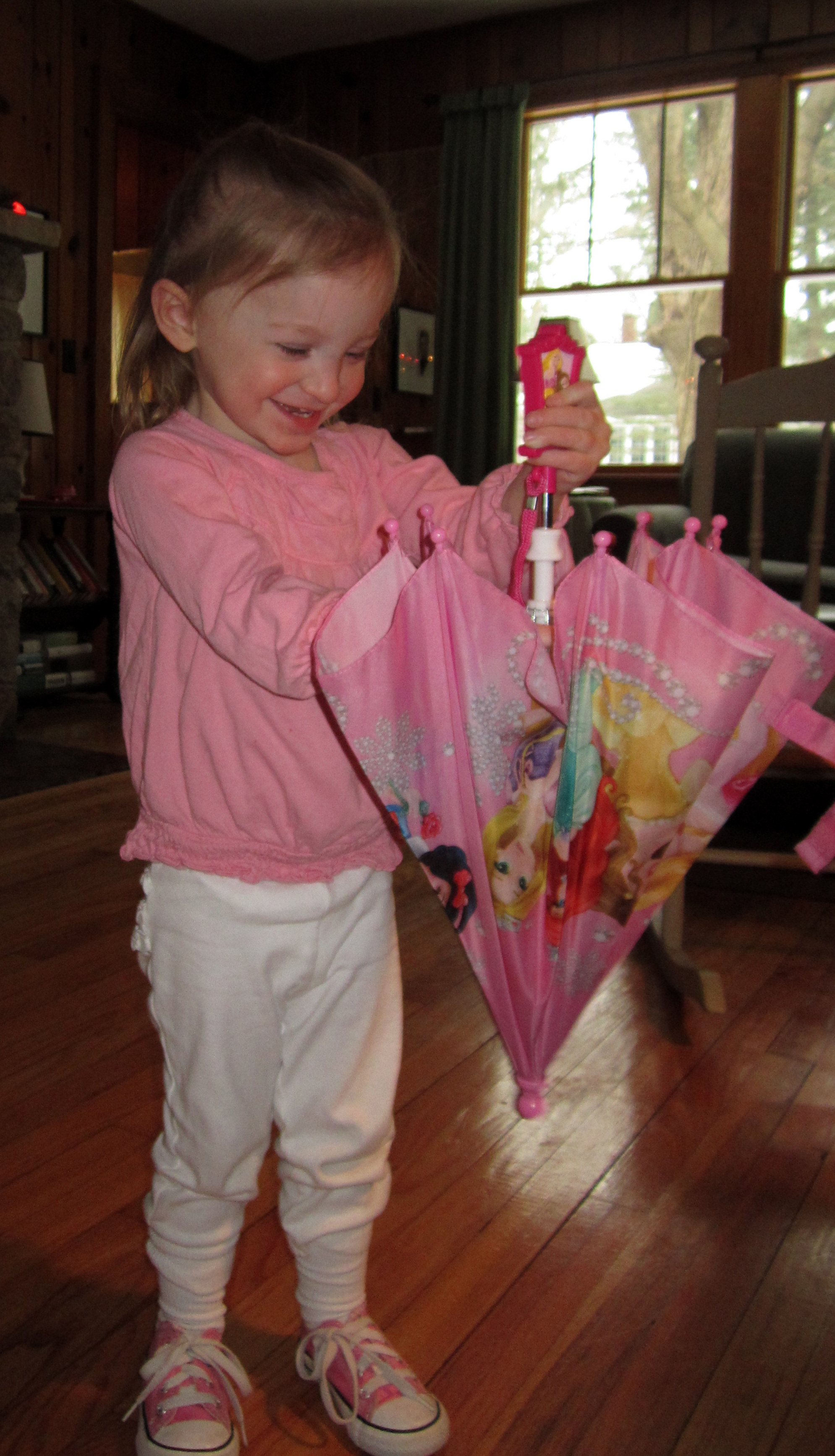 The two of us were out on the deck blowing soap bubbles when it began to rain. Emerald asked for her mini-umbrella (which sounded much like asking for her “ebola”), and I wondered if she might be able to open and close it herself. She badly wanted to do it.
