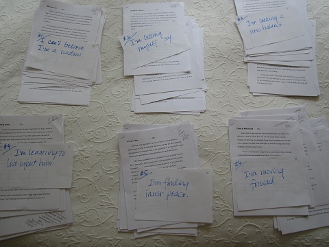 I decided to do it by using my 60 hard copies rather than flipping “pages” on a computer, since I needed to see them all at once. I spread them out on the bed and began organizing them by topic but ran into trouble when their titles didn’t remind me of their contents. The only thing to do was speed-read each one and label them with content-clues to help me.
