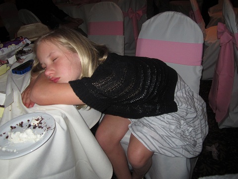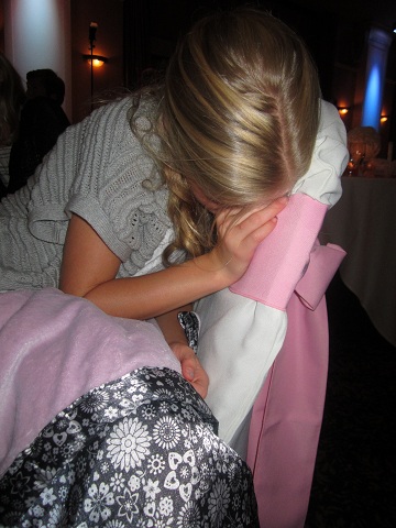 When the night of the actual wedding finally arrived, some of us found our energy flagging, and the young set was especially pooped. Their naps and down times had been set aside in favor of family fun, and energy was dwindling. By the reception, they were dropping like flies.