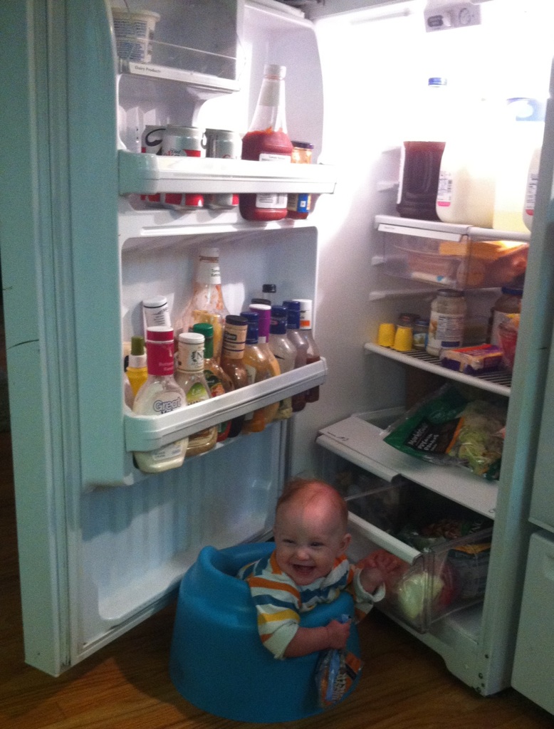 If I’m holding her when I open the refrigerator, she lunges toward its contents, fascinated by the variety of colors and shapes inside. This afternoon I decided she could help as I put food away and set her Bumbo in front of the fruit and veggie drawers. She happily banged them open and closed, sucked on the bag of mini-carrots, and rattled the salad dressing bottles overhead.