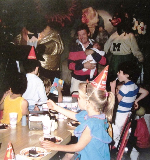 For example, here’s one taken at Chuck E Cheese’s. The occasion was Klaus’ birthday (turning 6), and Nate is holding 3 week old Louisa, his 6th child, while trying to manage the rest of his own children and a dozen young guests. The Chuck E Cheese entertainment stage was in full swing with it’s robotic characters singing at peak volume, a frenzy at best.