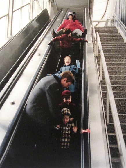 Another picture I’ve studied recently was taken on Christmas Eve. We’d lunched at Marshall Fields’ in Chicago’s Loop and were on our way back to the suburbs on the “L” train. (We only had 5 children at the time, though a nephew is also in the picture.) But once again, Nate is hard at work, watching over the precarious steps of a two and three year old about to stumble off the bottom of an escalator.