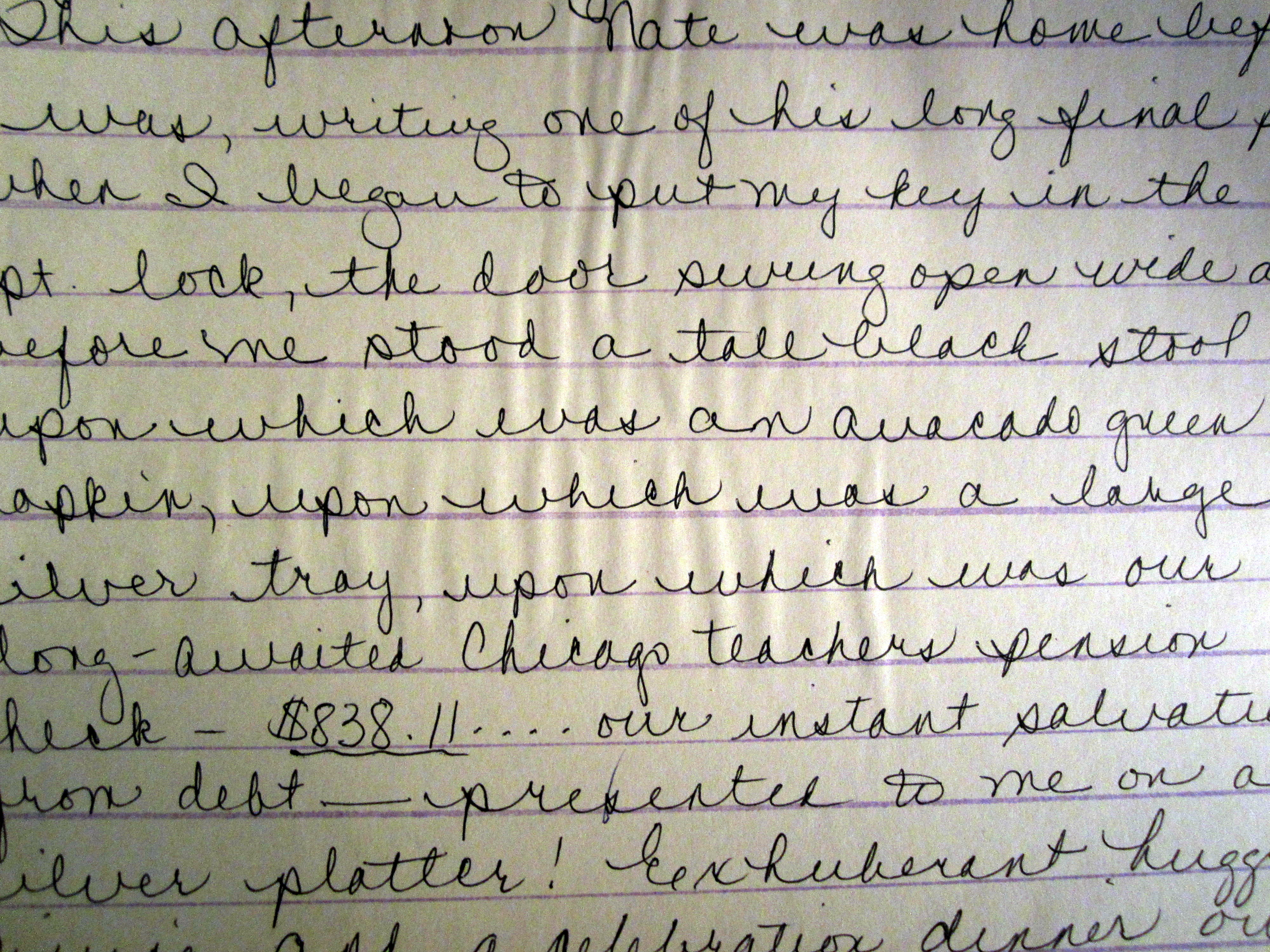 This afternoon Nate was home before I was, writing one of his long final papers. When I began to put my key in the apartment lock, the door swung open wide, and before me stood a tall, black stool upon which was an avocado green napkin, upon which was a large silver tray, upon which was our long-awaited Chicago teachers pension check — $838.11…. instant salvation from debt – presented to me on a silver platter! Exuberant hugging, kissing, and a celebration dinner out!