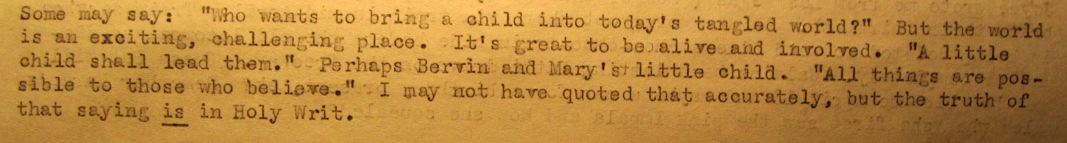 Some might say, “Who wants to bring a child into today’s tangled world?” But the world is an exciting, challenging place. It’s great to be alive and involved. “A little child shall lead them.” Perhaps Bervin and Mary’s little child. “All things are possible to those who believe.” I may not have quoted that accurately, but the truth of that saying is in Holy Writ. *